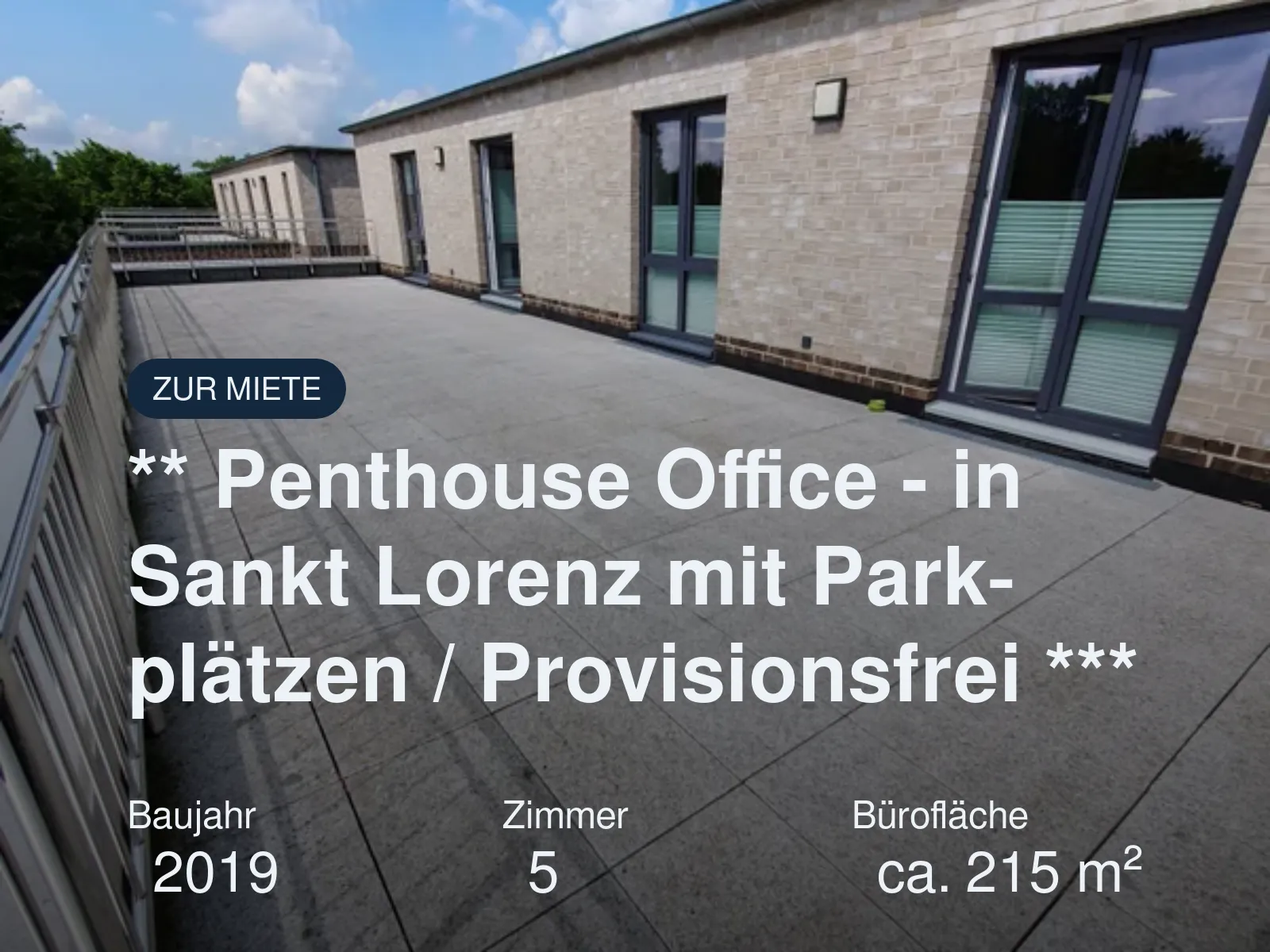 Repräsentativer und moderner Neubau-Komplex aus dem Jahr 2019 in Sankt Lorenz Nord ! Hier entstanden 3 identische Bürohausneubauten mit einer Gesamtfläche von etwa 2.163 m², verteilt auf 2 Vollgeschosse und ein Staffelgeschoss mit Dachterrasse. Im mittleren Gebäude steht nach Vereinbarung das 2. OG, welches gleichzeitig das Dachgeschoß ist zur Anmietung zur Verfügung. Bis zur etwa 5 PKW-Stellplätze stehen auf dem Grundstück noch zur Anmietung zur Verfügung.